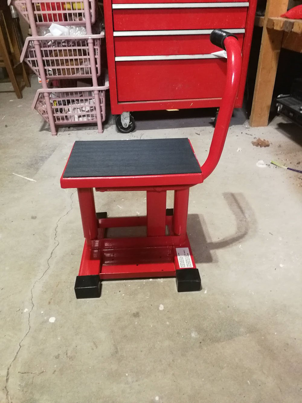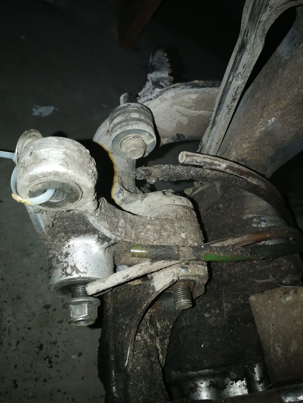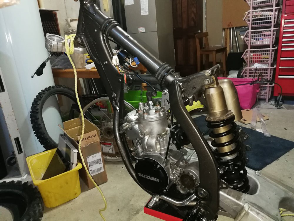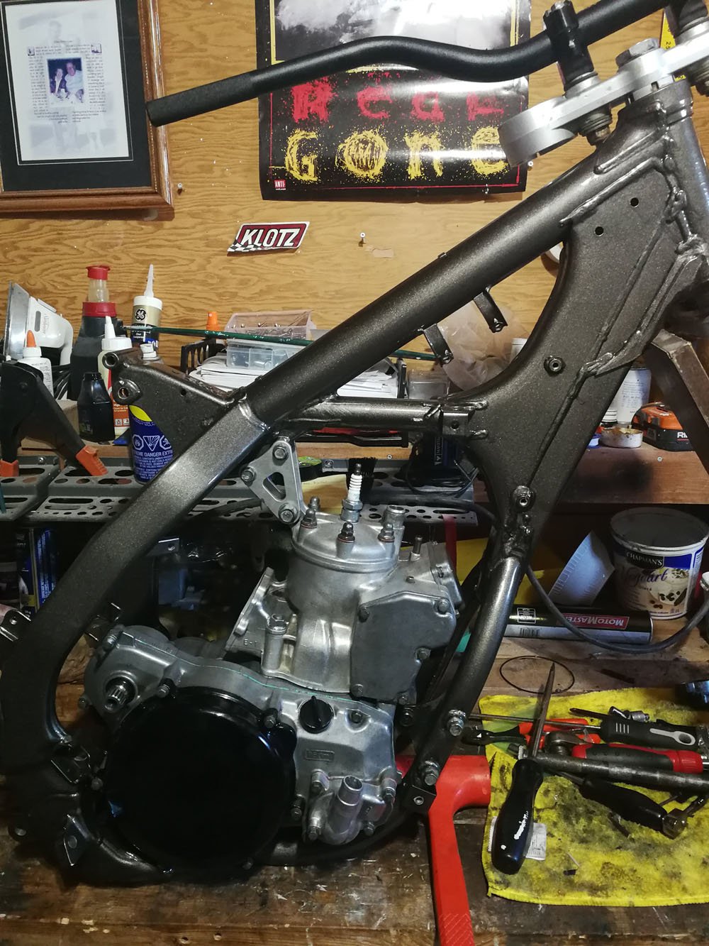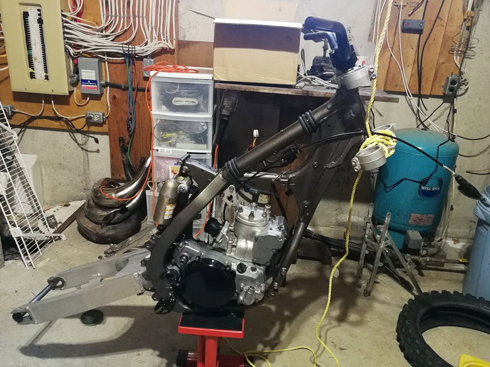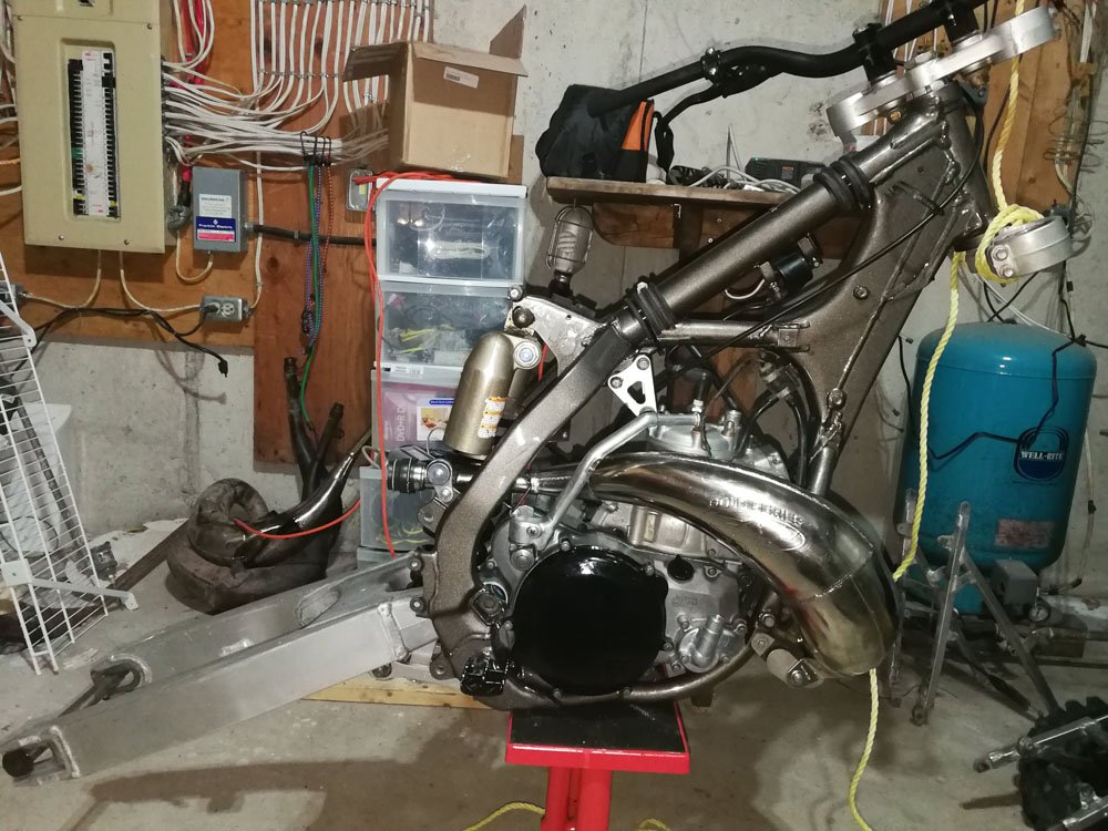 The furnace room, working on the swingarm.