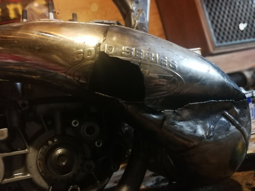 I had to buy a new exhaust pipe. I was going to try to fix the one I had or send it out, but in the end, it was easier and not terribly expensive to buy a new FMF Fatty. Bike also has an FMF Shorty silencer which has been repacked.