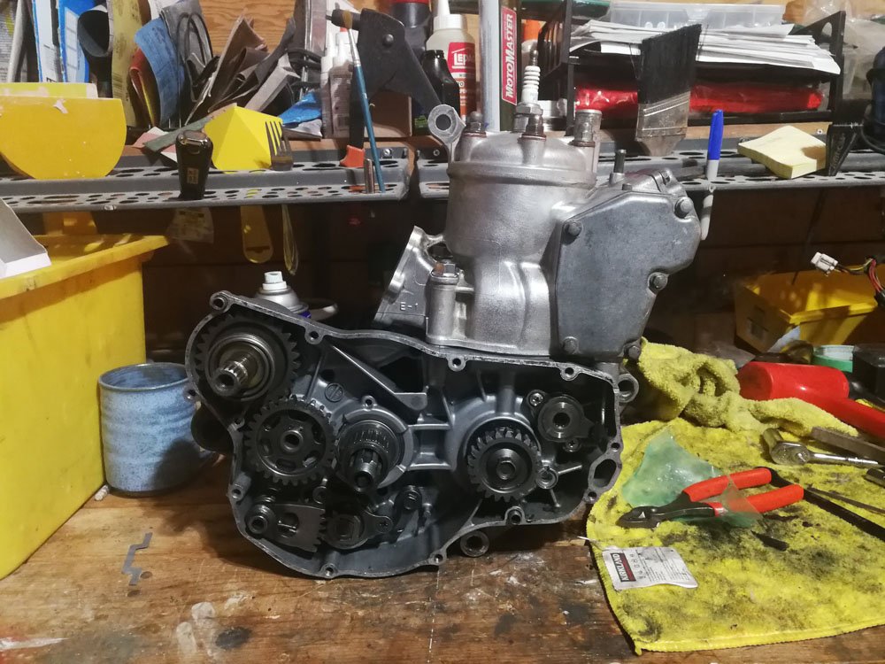 Korrey came for a visit to see how I was making out with the bike so we split the cases and found a bit of a mess. The tabs that hold on the shift drum were not screwed in place indicating that the engine was split, stripped of anything good and reassembled with all things bad. Most of the transmission gears were not usable, the engine was hastily assembled and never started. The bike was just put up for sale. The guy I bought it from either knew what went on or was lied to by his buddy that did the engine work. Either way, buyer beware.