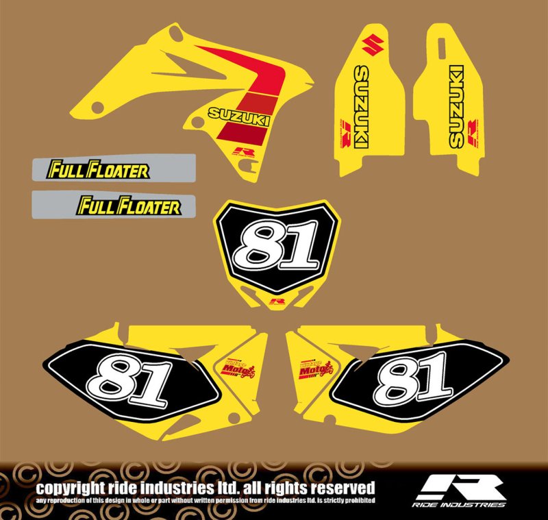 I thought of asking Pixel Works to make something for me, but decided against it as they don't know what sort of abuse MX bikes go through. I did not want to go back to Evo-MX or Decal Works in California because it can be a pain to import. The shipping, duty, exchange and taxes make the price unpredictable so I decided to find a Canadian company. I found Ride Industries in BC and talked to them on the phone. I find the seat on the RM-Z250 to be quite comfortable and I don't want to re-cover it just for aesthetic reasons so I had the idea to make a hybrid. Use the vintage 1984 look but use the 2013 colours.