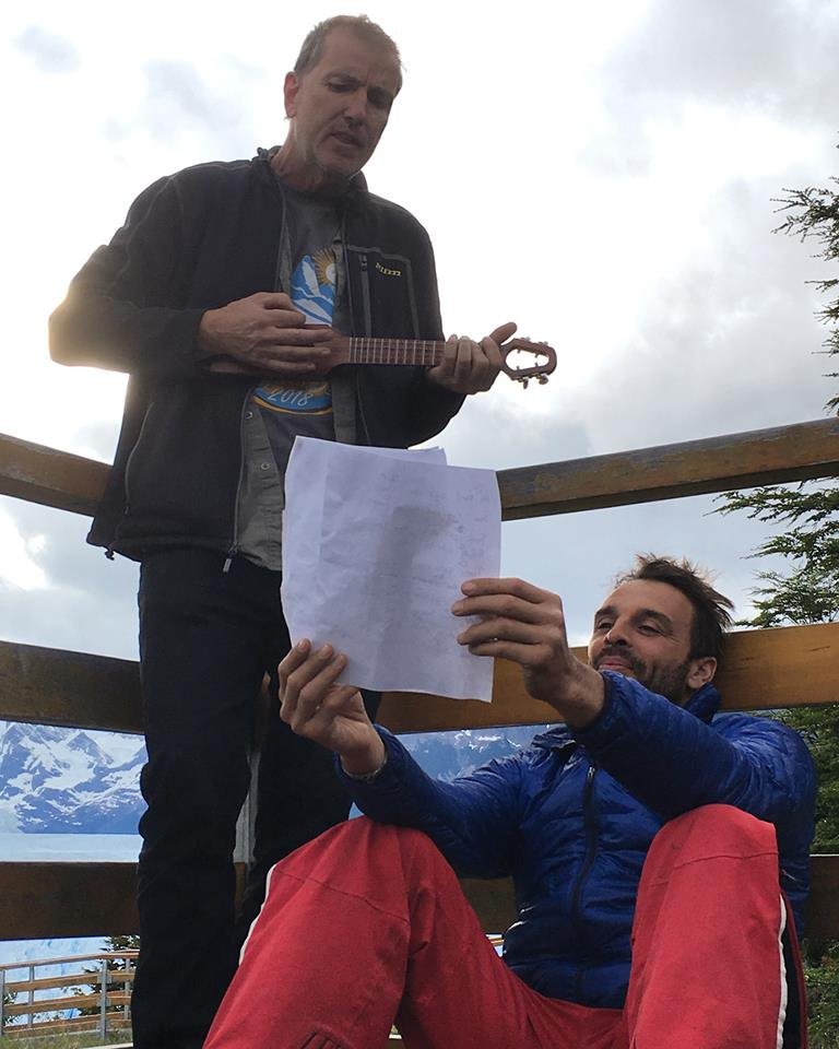 I only went on one bike-wash trip and then I devoted a few minutes to music. I brought with me on this trip a small travel ukulele. The body of it is about the dimensions of a 10" 2x4 and it has a concert ukulele-sized fretboard. I had taken it out a few times and played it and as bad as I am, I was still the only one there playing songs. During the long boring stretches of paved road, I kept my mind occupied by writing a song. The premise of the song was to take fictional characters and put them into the setting that we all shared in the Patagonia Rally for Rangers ride. I would ride for a while, make up a verse and when we stopped, I would write it out. I ended up with about 5 versus and managed to trim it down to three with a bridge to tie them together. My goal was to sing the song for my closing interview with the media crew and time was running out. This was the last day and all I had was a few short verses and tune in my head- I still had to figure out the chords and key. I went up to our room and wrote the song out onto paper and started putting in the chords as best as I could figure out in the short time I had to prepare. Once I felt the chords were close enough, I went and sang the song in front of the camera. My first crack at singing the song out loud was recorded. I even racked-up my harmonica and played that too. I messed up a little bit, but with all things considered, I pulled it off. Dylan and Aha were very encouraging, they liked it and I felt relieved to have completed my goal of writing and singing an original song from the roads of Patagonia. The photo at the top of the page is of me singing the song later in the day. Thanks to Phil Bond for the great photo.