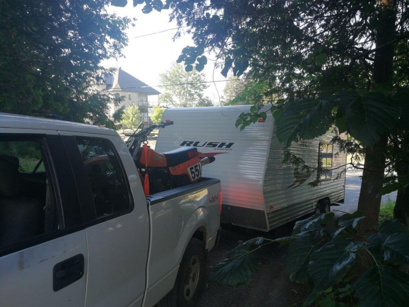 Using the facebook group I was able to reconnect with friends I had made at the SandDelLee event. Steven, Rochelle and Ian from the far eastern end of the province picked me up at my house in Dunrobin on Friday afternoon. Steven and Rochelle bought themselves a very nice toy hauler and with two bikes already in the back of the truck, they had room for my two bikes and Ian's in the trailer. We loaded up, jumped in the truck and just to add some drama to the trip, the engine wouldn't start. They were having some problems with the fuel pump and sometimes it just would not start. We gave the truck some time to think about it's behavior and indulged in a fine malt beverage on the deck. It seems that is all it took, and the Ford came to life and we headed off to our destination.